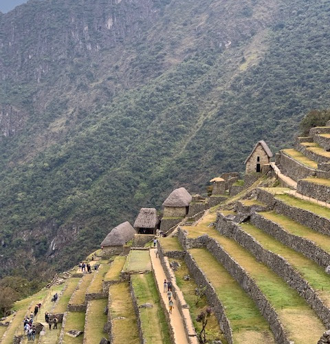 As we went up, we saw terraced earth on the hillside, covered in green. Incan terraces?! Definitely. Along about switchback ten, we saw MASSIVE terraced hillside. These were faced in heavy grey stone. It didn’t look like farming land as much as an entire amphitheater on the side of the mountain and the stage had just broken away and plunged into the river far below. If the amphitheater was giant-sized. These were far more dramatic than the ones at the lower, more boring elevation. “I think we’re coming to something,” said Rusty, who’d had his young-adult cool mostly overcome by the experience.